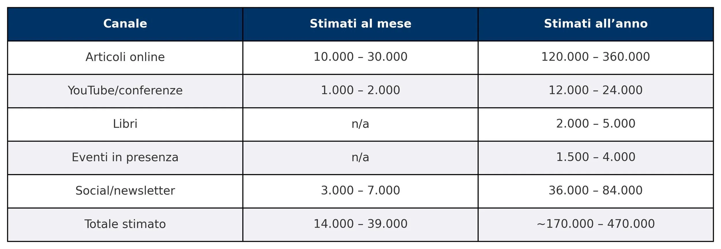 In media “sposta” tra 14.000 e 39.000 lettori al mese, con un pubblico annuale potenziale tra 170.000 e 470.000 persone, distribuite su canali cartacei, digitali, in presenza e sociali.